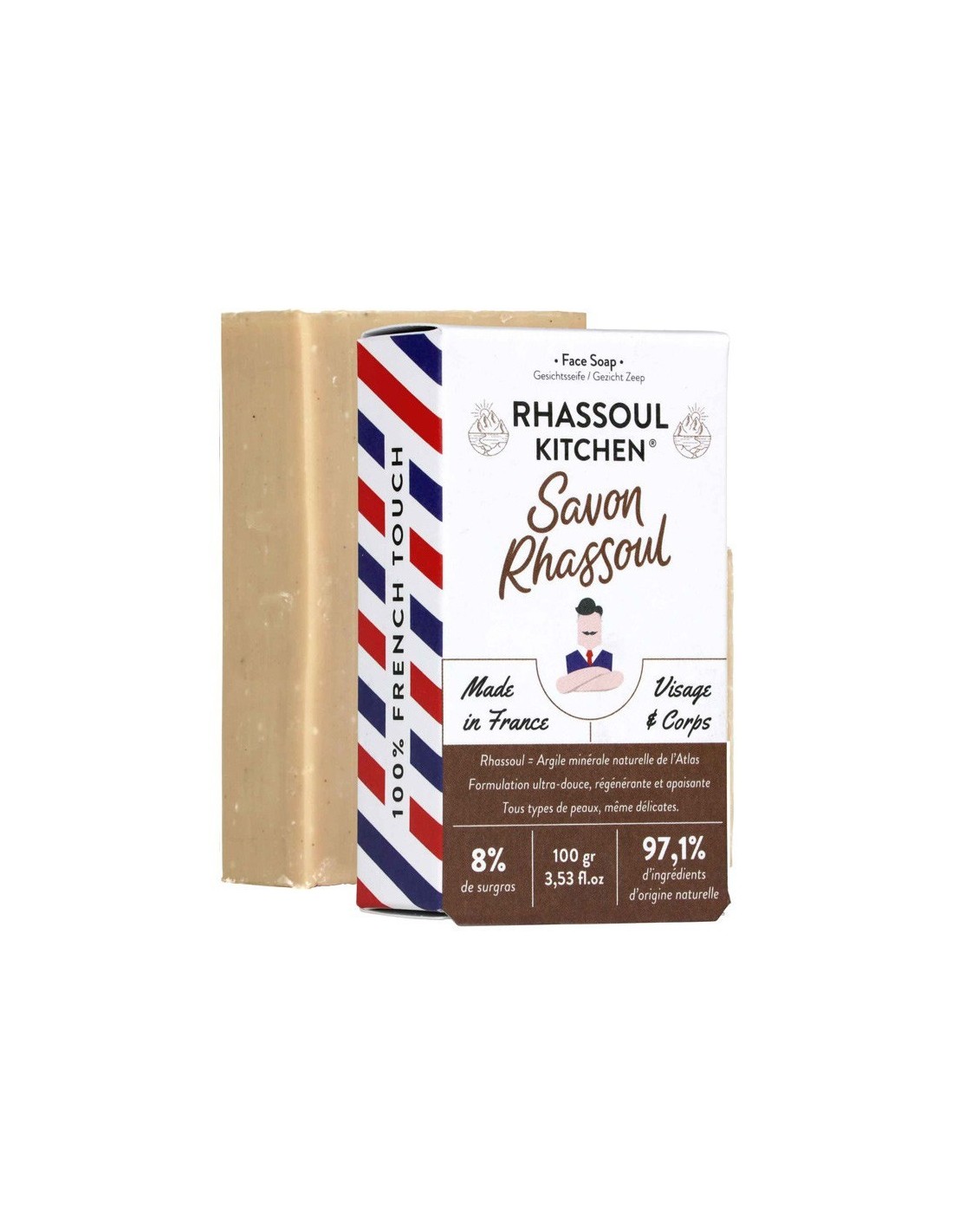 Rhassoul Face & Body Soap. In un solo gesto elimina e assorbe tutte le impurità senza seccare la pelle. Il suo ingrediente magico? Il Rassoul! Direttamente dalle montagne dell'Atlante, questa argilla minerale ha poteri detergenti, purificanti e rigeneranti unici. Con l'8% di burro di karité, nutre in profondità la pelle fornendo protezione e comfort. Con la sua schiuma ricca e setosa, Monsieur Barbier Rhassoul Soap viene utilizzato per il viso, il corpo e anche i capelli! Adatto a tutti i tipi di pelle, anche delicate.