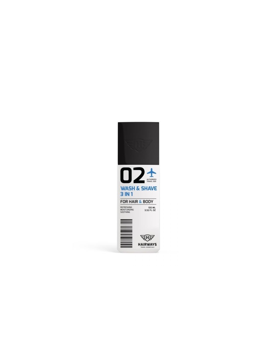 Il Wash & Shave 3 in 1 di Hairways è uno shampoo, gel doccia e gel da barba in 1, in una confezione formato da viaggio di 100 ml.